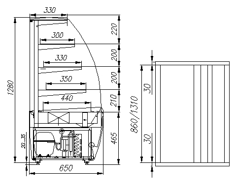 Модель выполнена с гнутым передним стеклом и прямыми боковыми стеклянными панелями, обеспечивая хороший обзор продукции. Задние створки выполнены из лёгкого и прочного оргстекла. Корпус витрины изготовлен из стали, боковины – из пластика. Пенополиуретановая изоляция обеспечивает надёжную термозащиту.