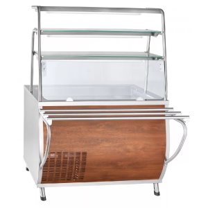 Конструкция прилавка произведена из высококачественной нержавеющей стали, которая отличается прочностью, долговечностью и устойчивостью к агрессивной среде кухни. Прилавок включает охлаждаемую ванну глубиной 89 мм, оптимальную для размещения напитков в бутылках и гастроемкостей с закусками. Над ванной расположены три открытые полки, которые подходят для выкладки блюд, не требующих охлаждения, таких как выпечка или закуски комнатной температуры. Для хранения кухонного инвентаря предусмотрен вместительный шкаф.
