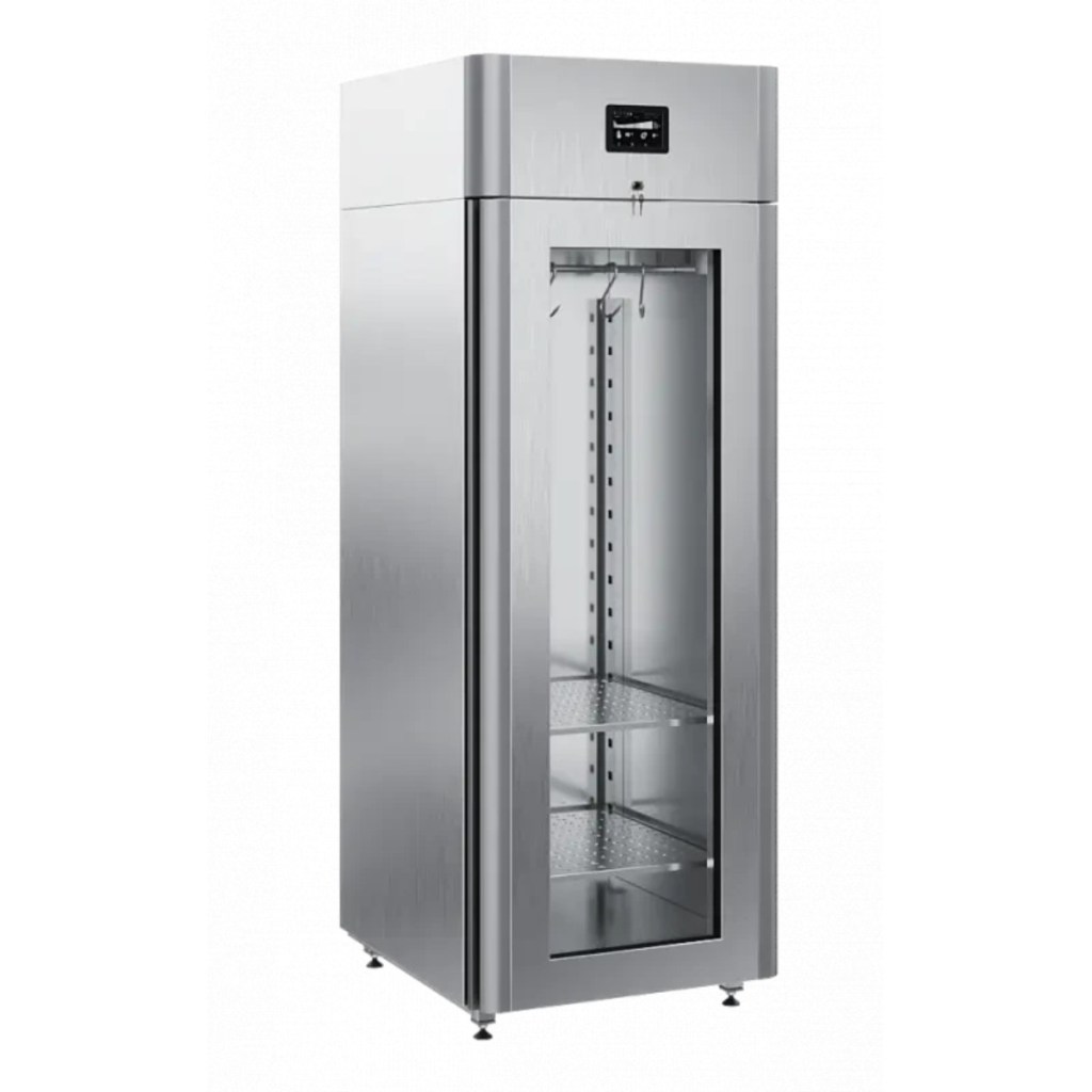 Каталог оборудования Холодильное оборудованиеШкафы холодильныеСпециализированные холодильные шкафыШкаф холодильный для вызревания мяса Polair CS107 Meat со стеклом (Тип 1) Шкаф холодильный для вызревания мяса Polair CS107 Meat со стеклом (Тип 1) Код товара: 062-627 Поделиться: WhatsAppTelegram СравнитьДобавить в КПВ избранное 0 399 500 ₽ В корзину 0 шт Под заказСамовывоз сегодня бесплатно Взять в кредит Купить в лизинг Получить консультацию в WhatsApp Описание Характеристики Отзывы 0 Инструкции 5 Шкаф холодильный для вызревания мяса Polair CS107 Meat со стеклом (Тип 1) предназначен для создания идеальных условий хранения и дозревания мяса на предприятиях общественного питания и торговли. Монолитный цельнозаливной корпус выполнен из нержавеющей стали как снаружи, так и внутри (за исключением задней стенки), что гарантирует высокую прочность, устойчивость к коррозии и простоту ухода. Дверь оснащена стеклопакетом для визуального контроля продукции. Оборудование рассчитано на эксплуатацию при температуре окружающей среды до +40 °С. Особенности: Верхнее расположение агрегата, обеспечивающее удобный доступ и оптимальную циркуляцию воздуха Многофункциональная русифицированная панель управления с дисплеем диагональю 5" для точной настройки режимов Возможность создания и сохранения собственных программ, что позволяет адаптировать условия хранения под разные виды мяса Штанга для подвеса крупных кусков мяса (максимальная нагрузка 80 кг) и 2 перфорированные полки (нагрузка до 40 кг на каждую), обеспечивающие гибкую организацию внутреннего пространства Встроенный ультразвуковой увлажнитель (необходимо подключение к системе очищенной воды и централизованной канализации) для поддержания оптимального уровня влажности UV-лампа для обеззараживания воздуха, минимизирующая риск появления нежелательной микрофлоры Распашная дверь с заливной теплоизоляцией, встроенной ручкой и сменным магнитным уплотнителем для надежного закрытия Отключаемая LED-подсветка, создающая комфортные условия обзора внутри камеры Штампованное углубление в дне корпуса для удобства уборки Педаль для открывания двери без помощи рук Толщина стенок корпуса: 43 мм Polair CS107 Meat со стеклом (Тип 1) — это профессиональное решение для хранения и созревания мяса, отвечающее строгим требованиям пищевых производств. Продуманная конструкция, функционал управления климатом, возможность подвеса и хранения больших кусков мяса, а также дополнительные системы (увлажнитель, UV-обеззараживание) позволяют обеспечить высокое качество продукции и повысить эффективность работы предприятия.Изображение товара, представленного на фото, может отличаться от его фактического вида. Показать все Габаритные размеры697×1005×1960 ммДиапазон рабочей температурыот -2 до +30 °CДлина697 ммШирина1005 ммВысота1960 ммОбъём700 лКол-во дверей1 Тип двериСтеклянная Количество полок2 штДопустимая нагрузка на полку40 кгУровень влажностиот 60 до 95 %Холодильный агрегатВстроенный Тип оттайкиАвтоматическая Тип охлажденияДинамическое ПодсветкаЕсть UV-лампаЕсть ХладагентR290 Вес нетто160 кгВес брутто190 кгБрендPolairВсе специализированные холодильные шкафы Из нержавейкиВсе специализированные холодильные шкафы Стеклянная дверь Оставить отзыв Еще никто не оставил отзыв на этот товар Схема POLAIR CS107-Meat.jpgИнструкция на POLAIR CS107-Meat.pdfБрошюра на POLAIR CS107-Meat.pdfДеклар