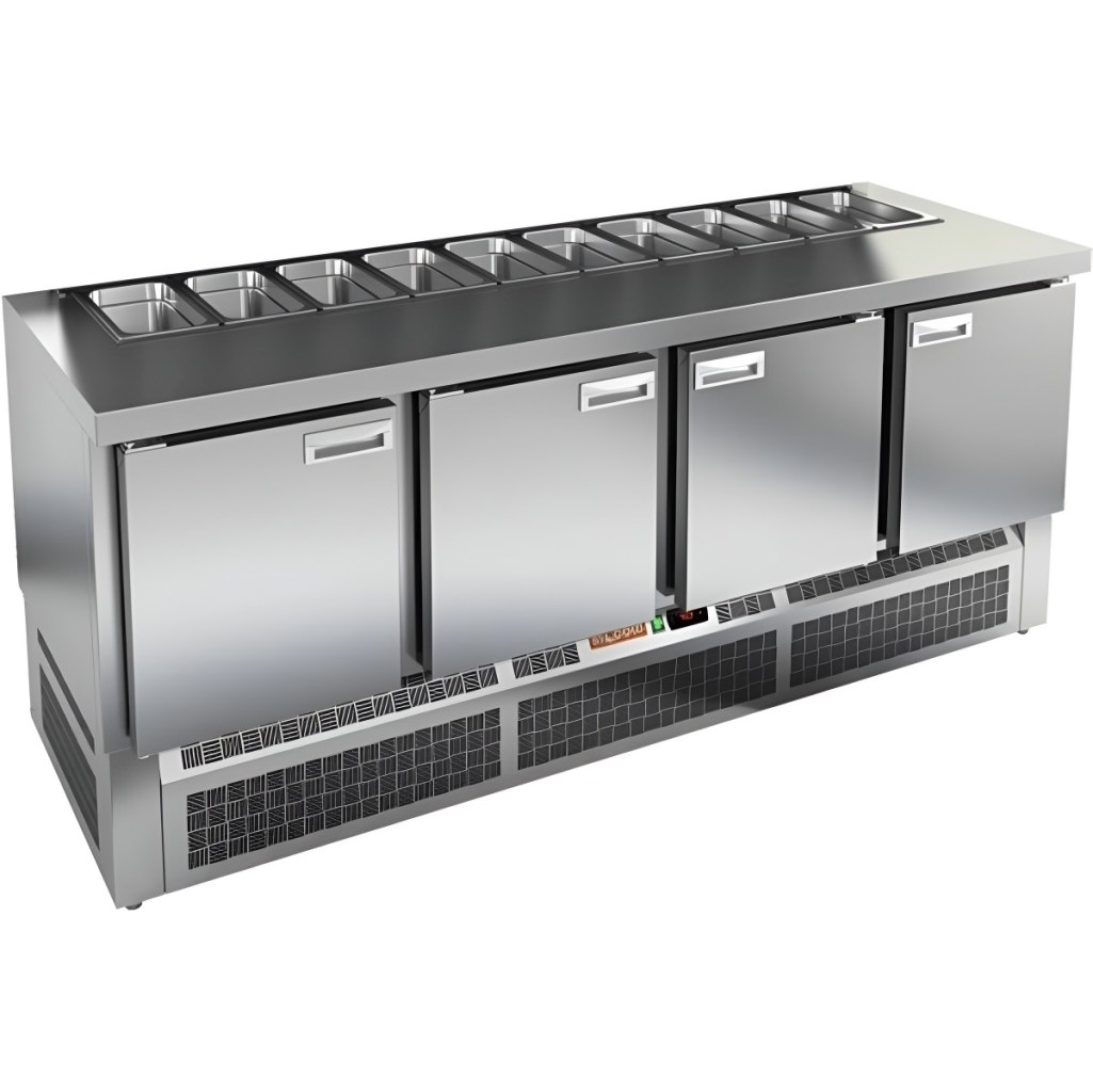Стол холодильный для салатов HiCold SLE2-1111GN (1/6) О без крышки — это профессиональный салатный стол, предназначенный для использования в кафе, ресторанах, пиццериях и других предприятиях общественного питания. Он совмещает в себе просторную рабочую поверхность и охлаждаемый объем, обеспечивая удобство и эффективность при приготовлении различных блюд — от салатов до пиццы.